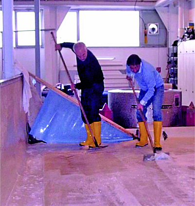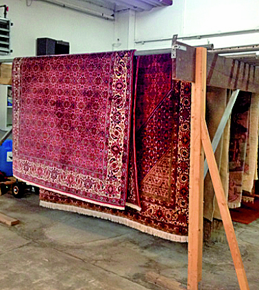 Nach der darauffolgenden Spülung erhält der Teppich nochmals eine Waschung mit verdünntem Essig der die Farbe auffrischt. Durch das Spannen beim Trocknen werden die edlen Stücke